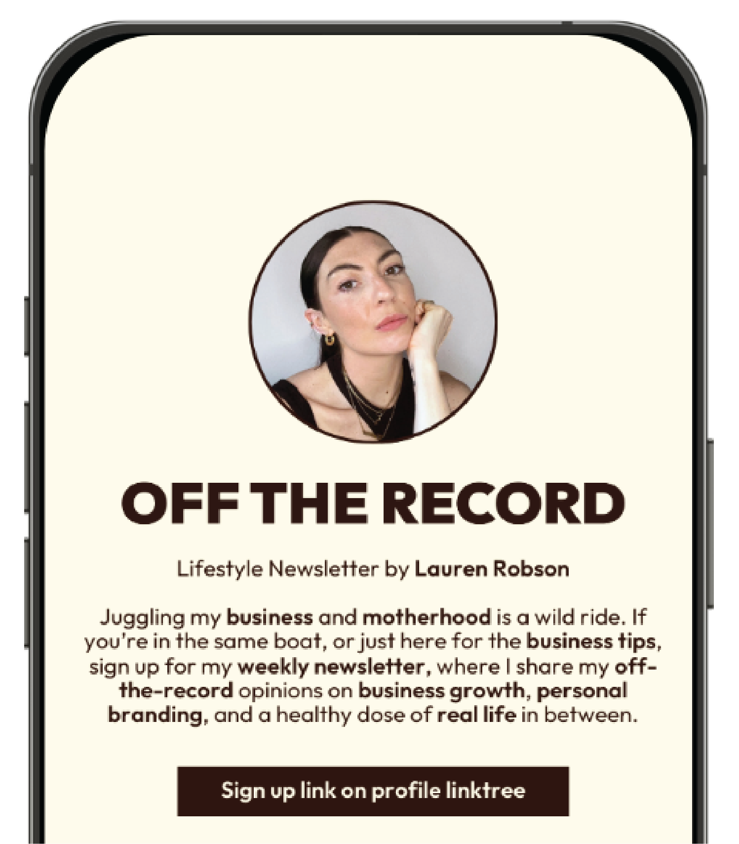 Being a self-employed business mama is a wild ride. Get Lauren’s lowdown on life, growing your business, personal branding and everything in-between in our weekly newsletter, Off the Record.